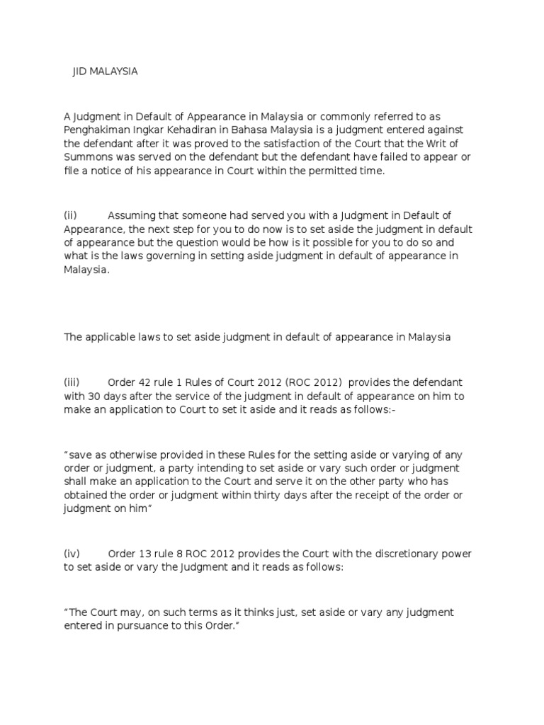 If you get notice of a default judgment or garnishment. A defendant who fails to file an answer or other legal response when it is due can request that the default be set aside, but must show a legitimate excuse and a good defense to the lawsuit. Certain types of foreign judgments are enforceable in malaysia by virtue of the 1reciprocal enforcement of judgments act 1958 (act 99) the case in point is the ritz hotel casino ltd. The applicable laws to set aside judgment in default of appearance in malaysia. If the party against whom a default judgment is sought has appeared personally or by a representative, that party or its. »the record company won by default… … Are handled somewhat differently on a state by state basis, and so will depend on where the civil action was filed. Things to take note of before the next step after obtaining a judgment in your favor as a creditor would be to commence execution proceedings such as filing for petitions for. Datuk seri osu haji sukam 2005 6 malayan law journal 760 wherein the high court in malaysia. If the defendant fails to enter appearance within the time limit, a judgement in default may be obtained against him. Judgment in default of appearance (jida) when the writ is served on the defendant, the defendant must enter appearance within the time limit. Setting aside default judgement if judgment was wrongly entered. Default judgments are sometimes called automatic judgments because of how fast they can happen.