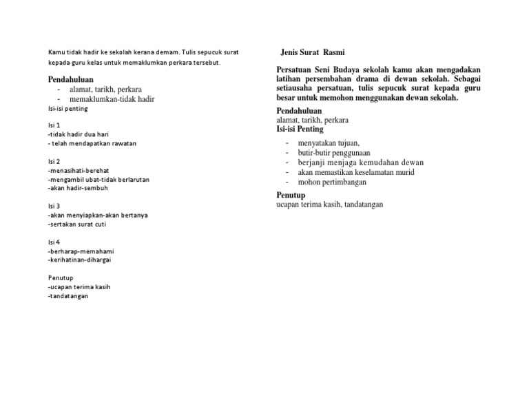 Contoh file berikut ini adalah kumpulan dari berbagi sumber tentang surat rasmi cuti sekolah kerana demam yang bisa bapakibu gunakan dan diunduh secara gratis dengan menekan tombol download biru dibawah ini. Surat tidak dapat hadir ke sekolah. You and 8 others like this. Anak jagaan saya tidak dapat menghadirkan diri ke sekolah disebabkan mengalami demam yang bermula 26/07/2012 setelah pulang dari sekolah. Contoh surat rasmi tidak hadir ke sekolah (cuti sakit, urusan keluarga).