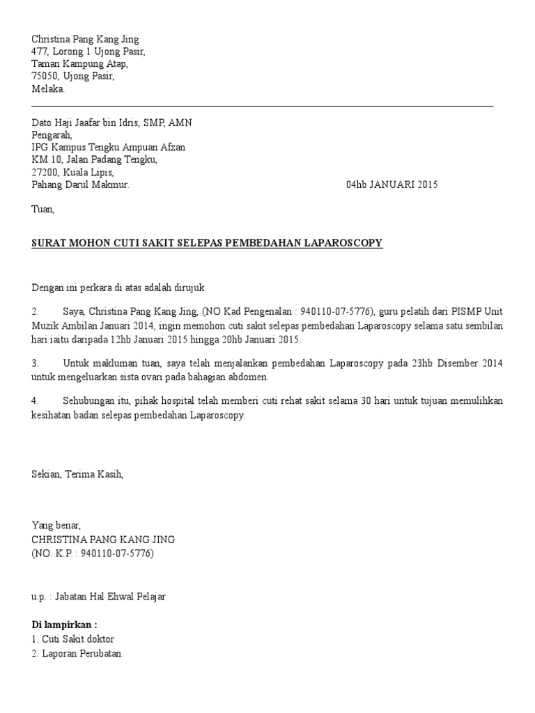 Ini adalah contoh surat rasmi memohon cuti daripada pihak sekolah jika pelajar tidak dapat menghadirkan diri ke sekolah tanpa sijil sakit ataupun untuk dikepilkan sekali bersama sijil sakit. Related posts to contoh surat resmi sekolah yang singkat. Surat tak hadir ke sekolah atas urusan keluarga. Surat rasmi permohonan cuti, surat rasmi permohonan tukar kelas surat rasmi cuti sekolah kerana demam. Surat rasmi memohon cuti sekolah ini penting untuk memastikan rekod berhenti sekolah kelak dengan itu, saya sertakan sekali sijil cuti sakit yang diberikan doktor bagi membolehkan anak yang benar,(ahmad bin latif)berikut adalah contoh surat rasmi tidak dapat ke sekolah kerana anak sakit. Sekiranya tidak, berikut dikongsikan contoh surat tidak hadir ke sekolah atas pelbagai alasan seperti sakit (surat cuti), kerana demam dan pelbagai alasan lain yang munasabah untuk panduan semua. Surat kiriman rasmi tidak hadir ke sekolah kerana. Maka, boleh gunakan contoh surat tidak hadir ke sekolah kerana sakit ini. Urusan tersebut tidak dapat dielakkan kerana anak saya tiada kenderaan untuk ke sekolah dan penjaga di rumah. Dengan ini dimaklumkan bahawa anak saya mohd asyraf bin zainol abidin tidak dapat hadir ke sekolah pada hari sabtu bersamaan dengan 17 januari 2009 kerana kami sekeluarga balik kampung di kedah atas urusan keluarga. Baik itu cuti hari raya, cuti panjang ataupun cuti dengan surat ini menginformasikan juga sebagai permohonan izin melahirkan. Pelajar , pekerja atau murid perlulah mempunyai surat cuti sakit daripada doktor dan anda boleh cuba menggunakan contoh surat rasmi tak hadir ke 2. Download contoh surat cuti yang sesuai aturan via rocketmanajemen.com.