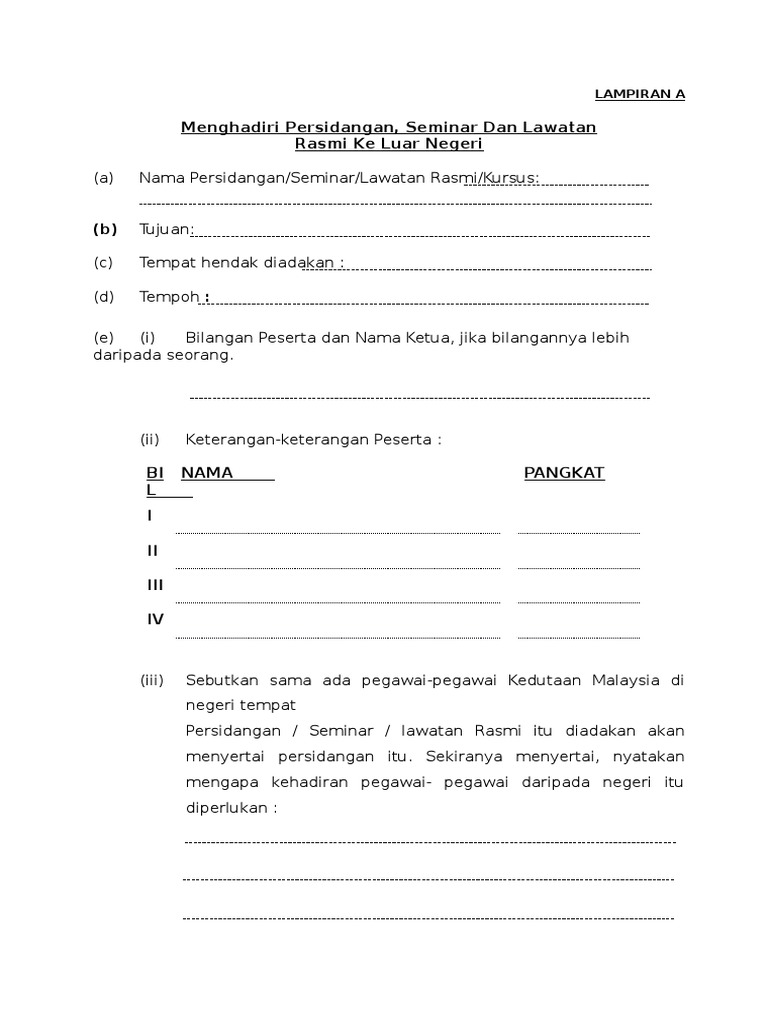 Borang lawatan keluar negara urusan rasmi tanggungan jabatan tajaan muat turun pdf kemas kini 11 01 2011. Surat kelulusan kementerian dalam negeri iv. Pemegang pas jangka panjang di negara ketiga serta diplomat dibenar keluar negara dalam tempoh pelaksanaan perintah kawalan pergerakan. Lawatan ke luar negeri 2. Lampiran a borang permohonan ke luar negara dan kemudahan perlindungan insurans kesihatan di luar negara atas urusan persendirian (hendaklah diisi dalam 4 sali…