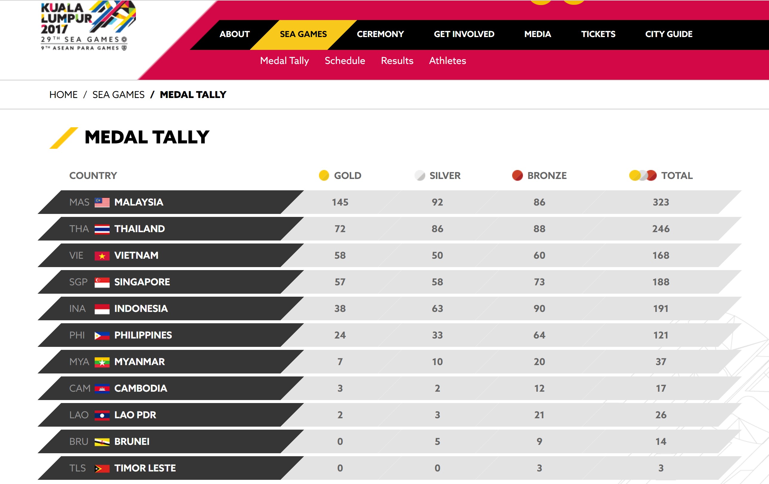 Related : 2017 Sea Games Medal Tally - The table of medals won by 11 countries competing in the kuala lumpur 2017 sea games which runs through aug 30..